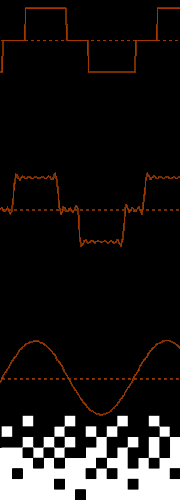 If a typical digital audio processor were fed this signal, it would connect these existing sample points at a higher sampling rate and pass it through a low-pass filter, resulting in the middle trace. Those who are familiar with tests of digital-to-analog converters may recognize that sort of image: if that signal were to appear on the analog output of a D/A converter in a review, the reviewer might say that it had produced a "perfect sine wave". This is because it shows that there is very little analog noise introduced by the D/A converter itself, and it is faithfully reproducing the filtered digital signal. The mathemeticians among us may cringe, however, to call that a "perfect sine wave". Although it may contain very little noise above the audio band, the difference between that data and a true sine wave is noise within the audio band. That noise was generated by the loss of resolution when that signal was first converted to the digital domain.